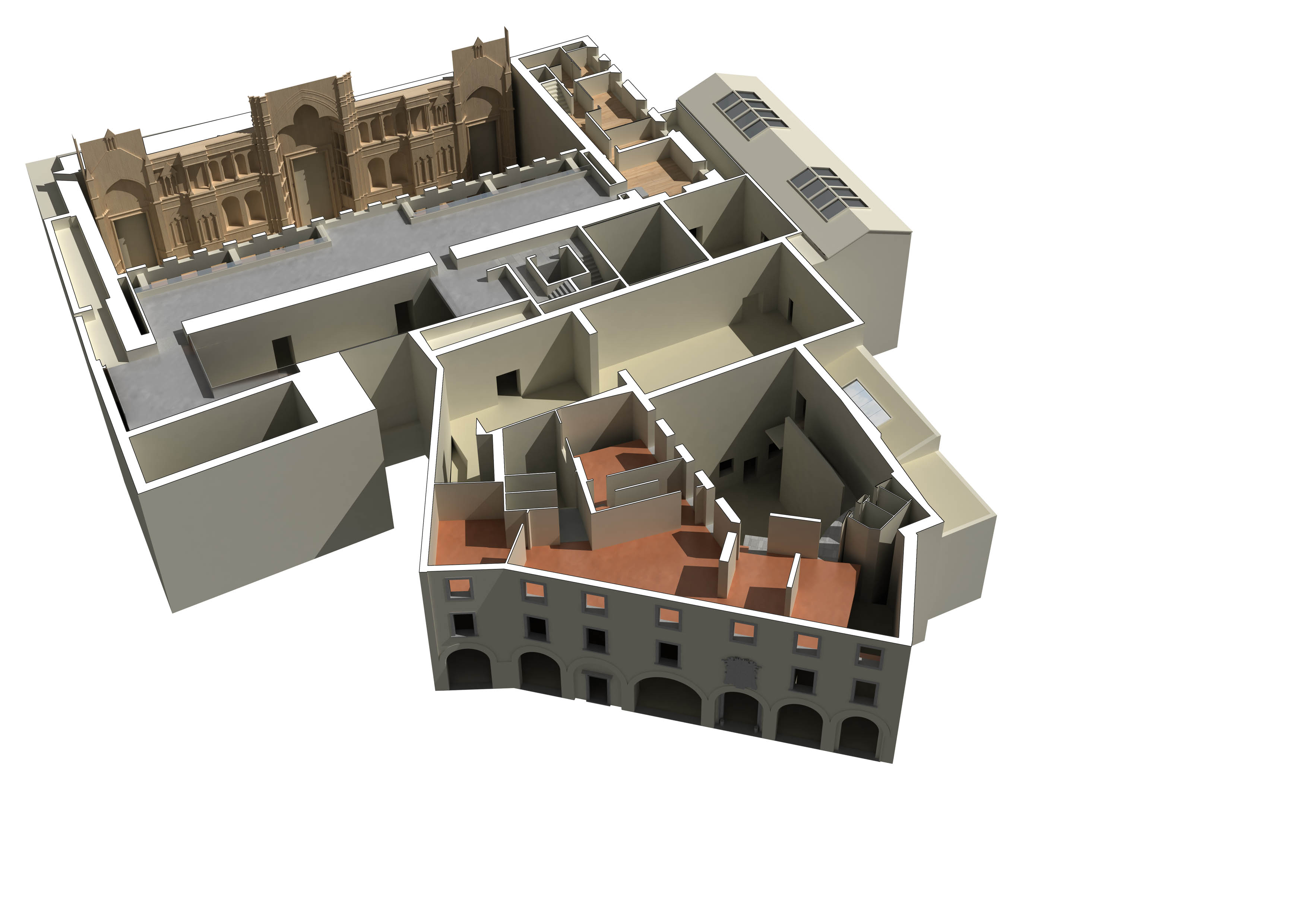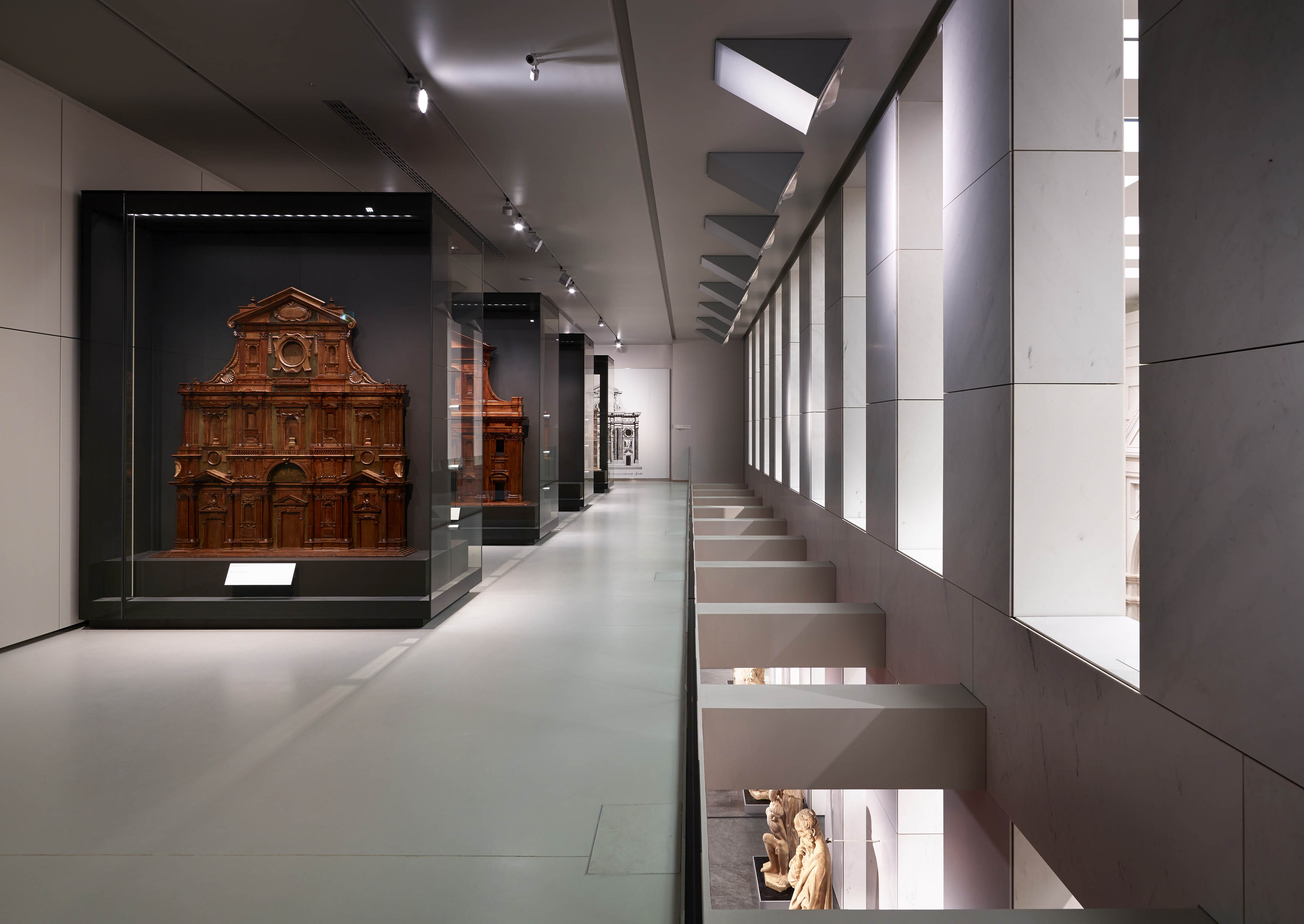 Nel museo abbiamo evocato l’antica facciata con un modello a grandezza naturale, basato sul disegno di Bernardo Poccetti, realizzato con membrature architettoniche in resina caricata con polvere di marmo su una struttura metallica e ricollocando le sculture nelle loro posizioni originali. La grande sala che un tempo era il Teatro degli Intrepidi (prima di diventare un malinconico garage) ora è un teatro dell’architettura e costituisce la scena fissa su cui si muovono le opere d’arte intrattenendo i loro mutevoli rapporti e i loro dialoghi con i visitatori. Sui due lati lunghi si confrontano due facciate: quella Arnolfiana (abitata dalle sculture) e quelle di marmo bianco con tre porte (quelle del Battistero) e trenta finestre. Dietro alla facciata di marmo bianco, su tre gallerie a diversi livelli, sono ospitate le statue antiche, quelle del campanile e i modelli storici per la facciata del duomo. Attraverso le finestre le statue dialogano con quelle della facciata. La parete traforata prosegue con lo stesso ritmo nei lacunari della copertura della grande sala, dove le aperture, fanno piovere la luce zenitale proveniente dai lucernari. Molte altre sale sono le sale del museo: accennerò solo a quella della Pietà. La Pietà ha avuto una storia travagliata, finalmente approdata al Museo… volevamo darle una collocazione serena, dove potesse trovare lo spazio e la luce che le era destinata, così sta su una sorta di mensa di pietra in una stanza alta sotto la luce che viene dall’alto.